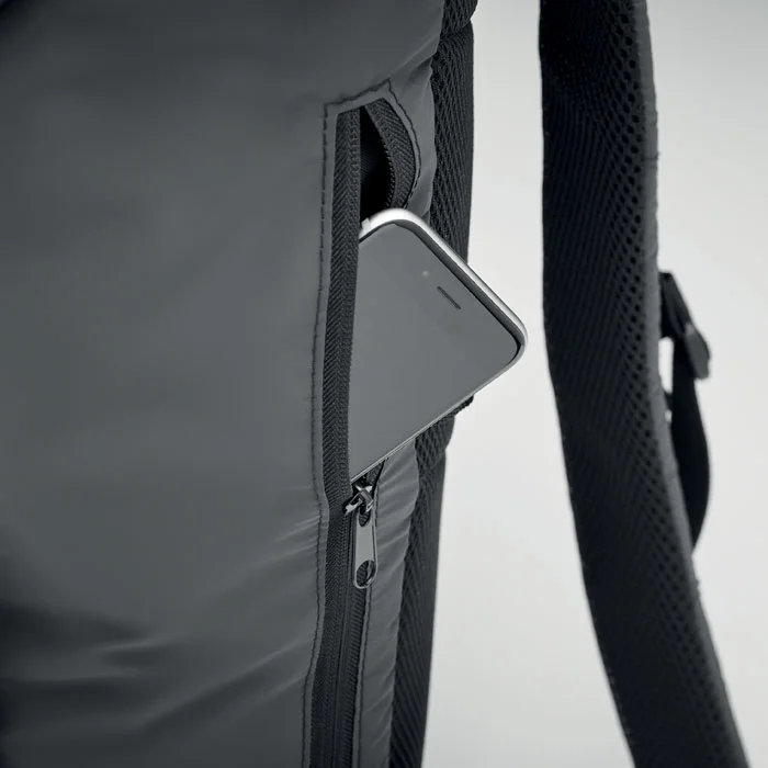 Светоотражающий рюкзак из полиэстера 190T. Боковой наружный карман на молнии и мягкая спинка, внутренняя подкладка с застежкой-шнурком. Большое внутреннее отделение для ноутбука с мягкой подкладкой. Регулируемые плечевые ремни с мягкой подкладкой, нагрудный и поясной ремни с застежкой-пряжкой. Водоотталкивающая пропитка.